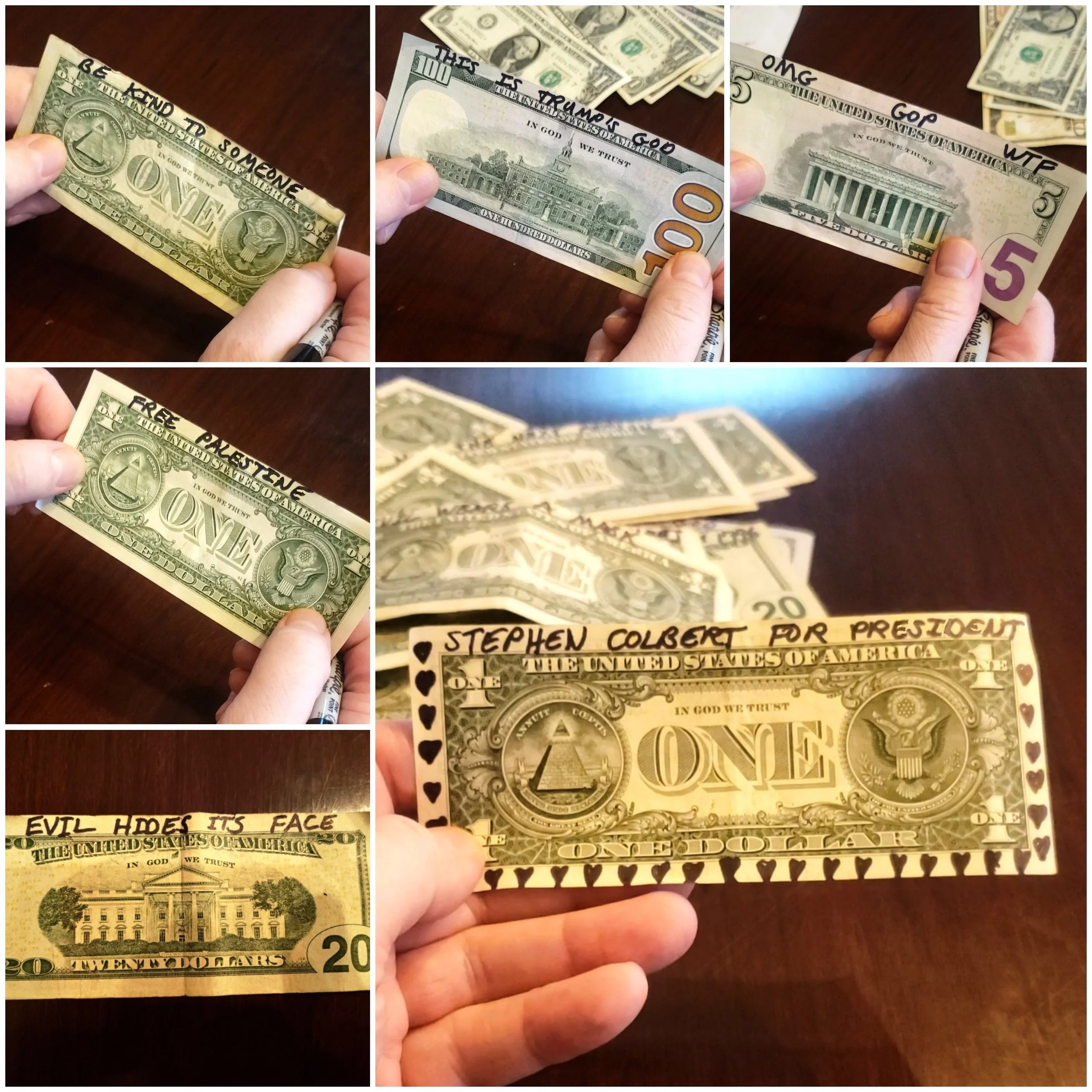 If you write your message, on ten $1 bills and disperse them in the economy, that means potentially 1,100 people will see your message in a year. If only 1,000 people do this, over ONE MILLION people will see a message for change or hope or unity in the course of a year. If 100,000 people do this, an inspiring message can reach almost 1/3 OF AMERICA in just one year!