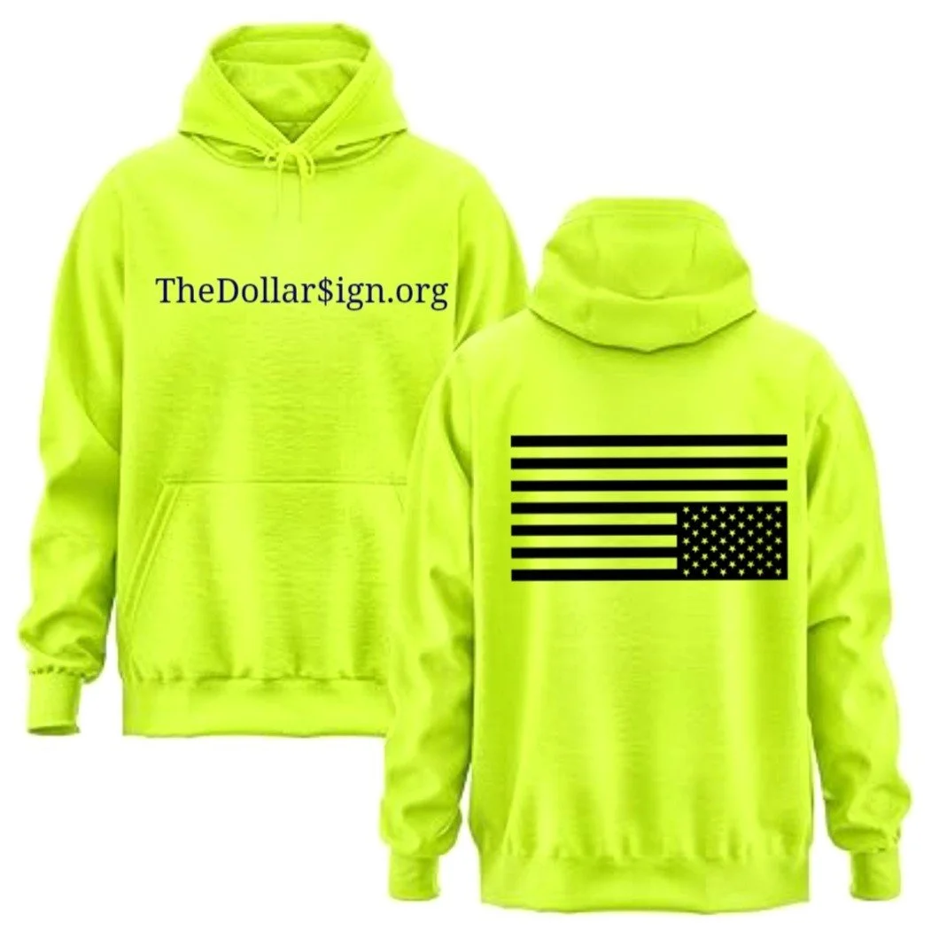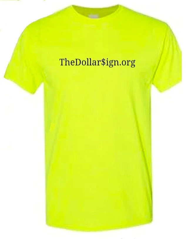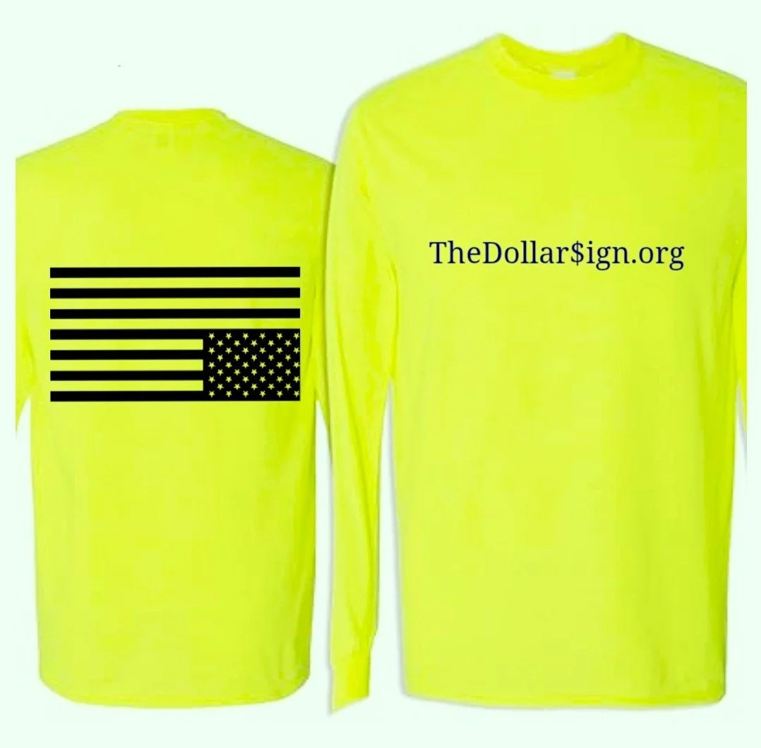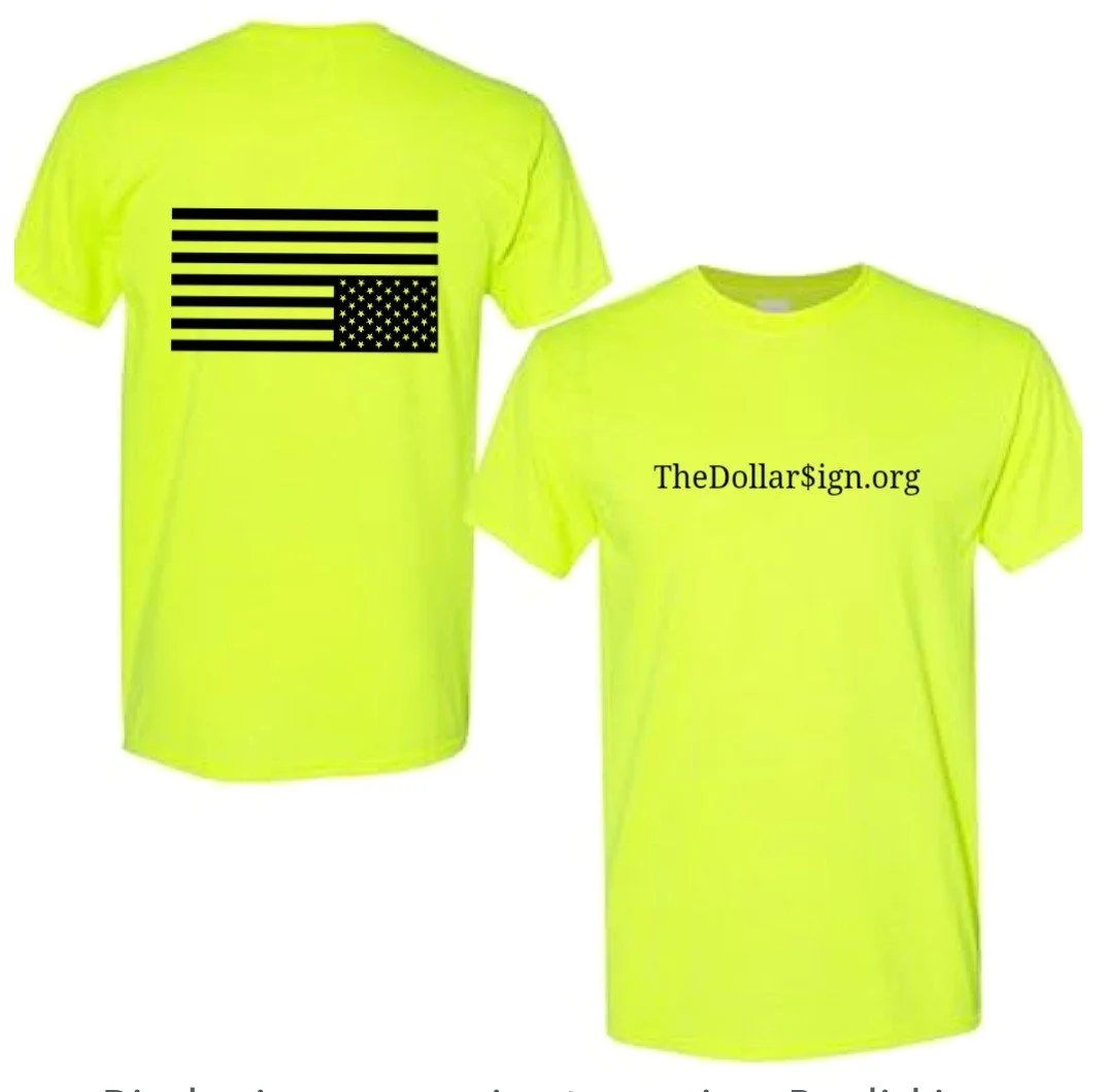 TheDollar$ign.org is prominently displayed across the front and some items have an upside down flag on the back indicating the fact that our nation is in distress. We do offer some of our apparel items in white for those who prefer something a little more understated in terms of colors, but not in messaging.